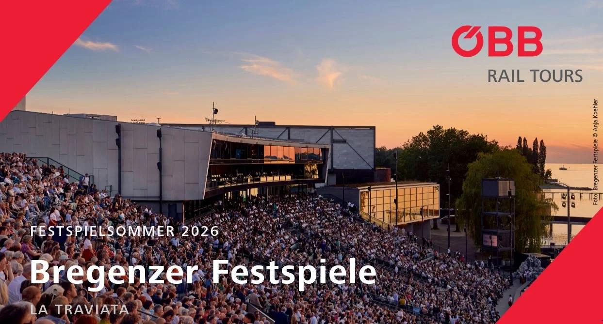 LA TRAVIATA - Bregenzer Festspiele 30.7. oder 20.8.2026: inkl. Bahn ab/bis Wien, 1 Übernachtung in Dornbirn inkl. Frühstück, 1 Sitzplatzkarte für die Bregenzer Festspiele - La Traviata (Kategorie 5), Öffi Ticket für die Fahrt Dornbirn-Bregenz am Vorstellungstag ab € 315,- p.P. im Doppelzimmer